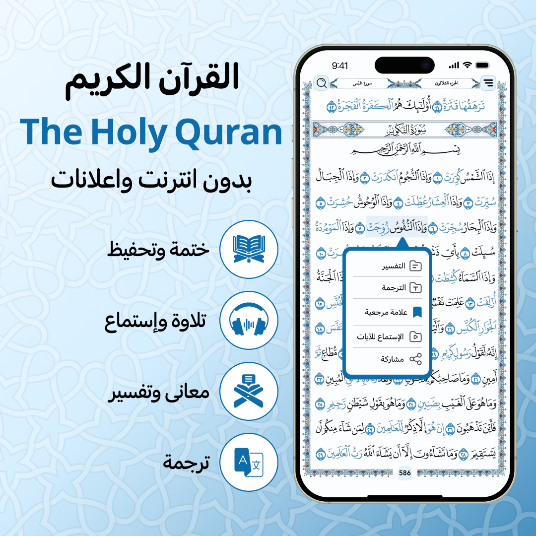 تطبيق رائع جدا متاح للتلاوة دون انترنت يتيح قراءة جميع التفاسير لكل ايه بمنتهى السهولة وكذلك سماع التلاوة لكل القراء جزى الله القائمين عليه كل خير