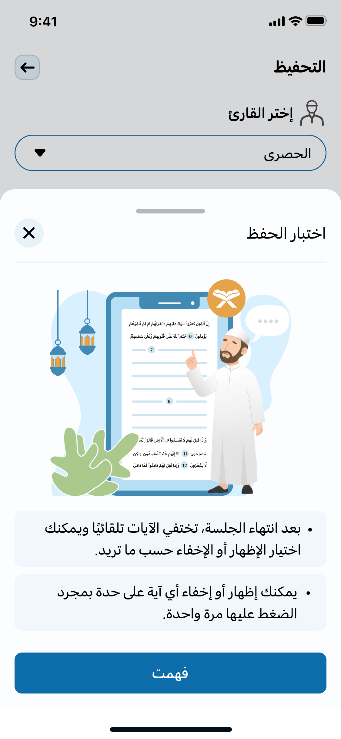 بعد الانتهاء من جلسة التحفيظ، يمكن الانتقال مباشرة إلى الاختبار التفاعلي، حيث تُخفى الآيات تلقائيًا، ويمكن للمستخدم الضغط على كل آية لإظهارها أو إخفائها حسب الحاجة.