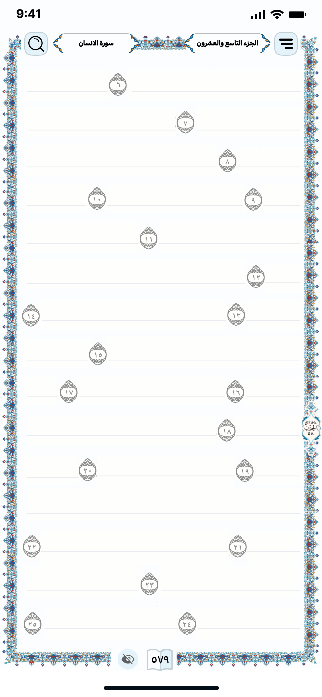 تتيح هذه الميزة للمستخدم إخفاء جميع آيات الصفحة أو إظهارها مجددًا بضغطة واحدة على رمز العين في الصفحة الرئيسية للمصحف.